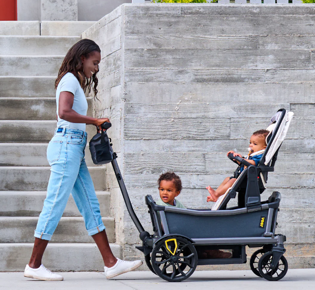Cruiser City gives your family the fun and all-terrain versatility of a Cruiser but offers the push steering and ample kickspace of a traditional stroller. Cruiser City is perfect for families that love to push on sidewalks, paths and through local attractions with seating for 2. Cruiser City features swivel wheels furthest from the handle, which enable it to be steered like a traditional stroller when pushing on smooth terrain. But don’t worry, the handlebar can also drop into wagon mode for pulling over uneven terrain.